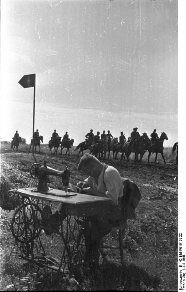 Немецкий солдат читает книгу, сидя за швейной машинкой, Молдавия на советско-германском фронте в июле 1941 г.