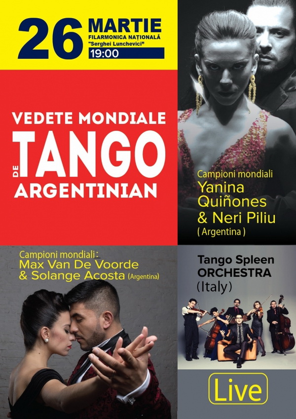 De Ziua Mondială a Teatrului, pe 26 martie 2017, ora 19.00, pe scena Filarmonicii Naționale, va avea loc un spectacol grandios cu participarea vedetelor mondiale de tango argentinian - NERI PILIU ȘI YANINA QUINONES (ARGENTINA), cei care deja au cucerit inimile chișinăuienilor cu performanța lor de succes de Ziua Internațională a Tangoului, precum și a campionilor mondiali de Tango Escenario - SOLANGE ACOSTA ȘI MAX VAN DE VOORDE (ARGENTINA).