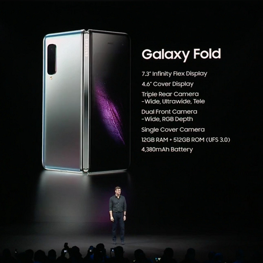 Galaxy Fold состоит из двух половинок и в сложенном виде чем-то (возможно — солидной толщиной и вытянутой наподобие школьного пенала формой) напоминает предшественников смартфонов — карманные коммуникаторы с QWERTY-клавиатурой. Когда устройство сложено, работает довольно маленький (диагональ 4,6 дюйма, разрешение 840 x 1960 точек) экран на лицевой стороне. Если раскрыть "пенал", заработает гибкий дисплей Infinity Flex с диагональю 7,3 дюйма (1536 x 2152 точек).