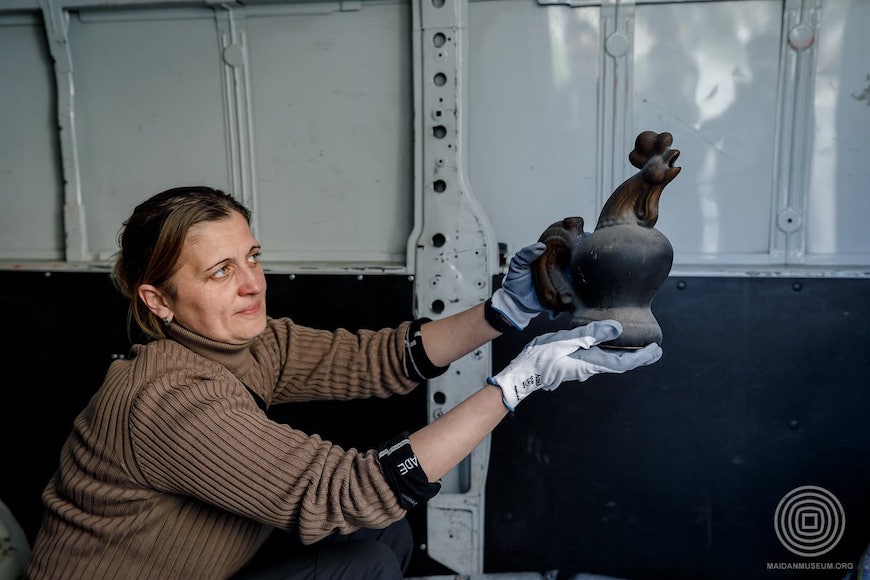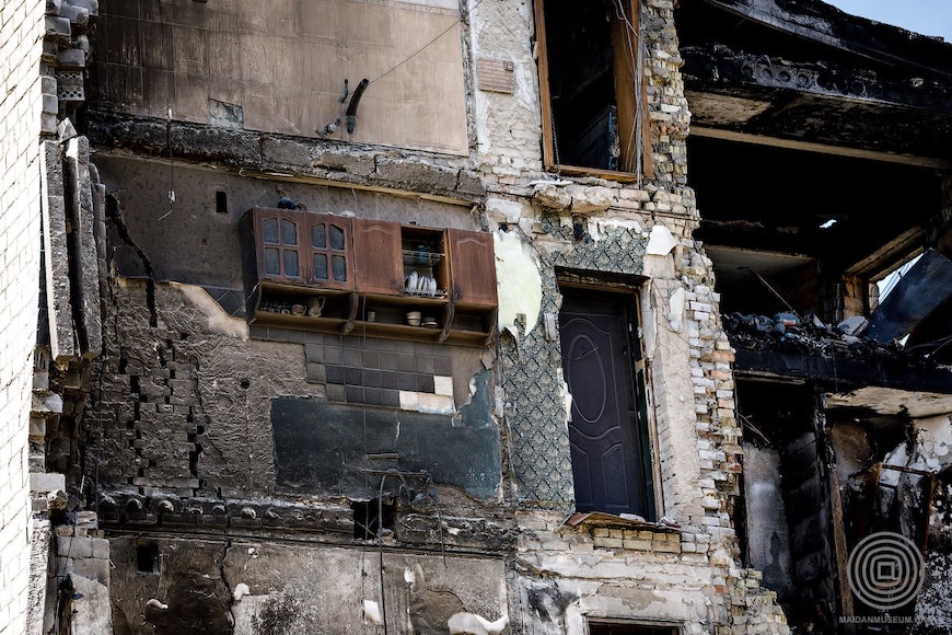 Символ стойкости украинцев – кухонный шкафчик на стене разрушенной бомбой многоэтажки в Бородянке передали в Национальный музей Революции Достоинства вместе с декоративным керамическим петушком.