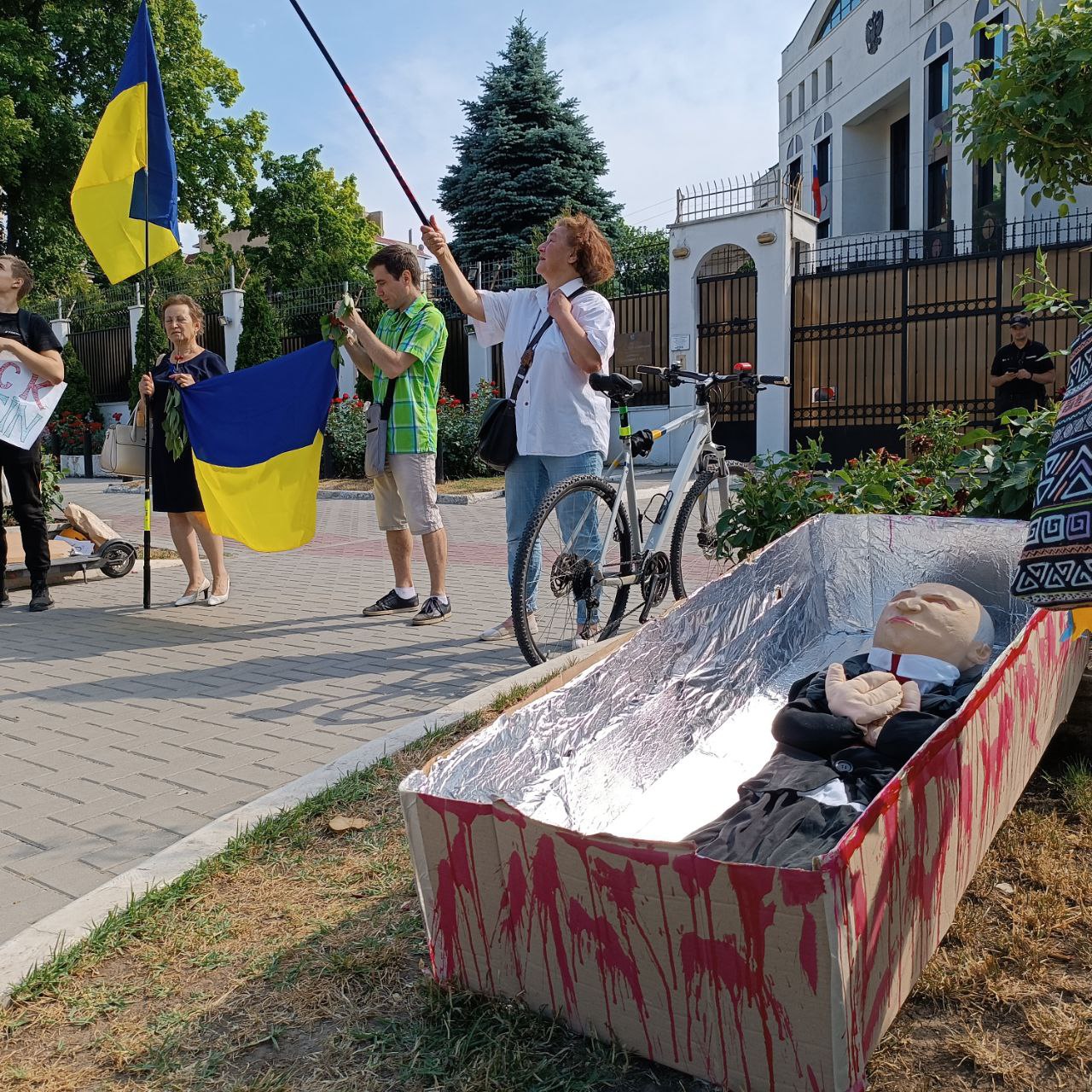 Вчера, 12 июня, вДень России у посольства России в Кишиневе прошла акция протеста против войны в Украине. Участники акции принесли плакаты с надписями: «Нет войне», «Молчание синоним лжи», «Херсон — это Украина». Также активисты принесли к зданию посольства похоронные венки и импровизированный окровавленный гроб с чучелом  президента России.