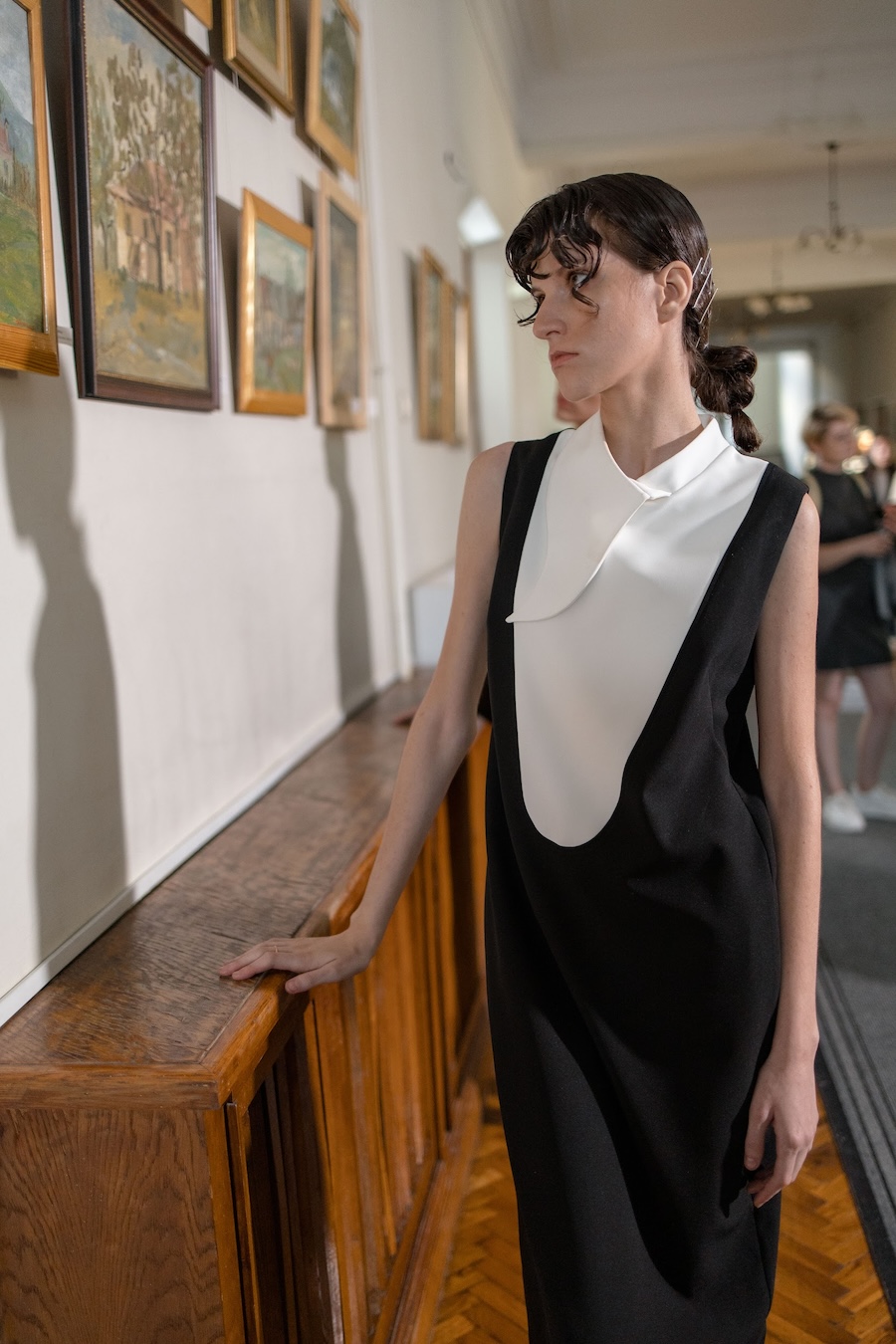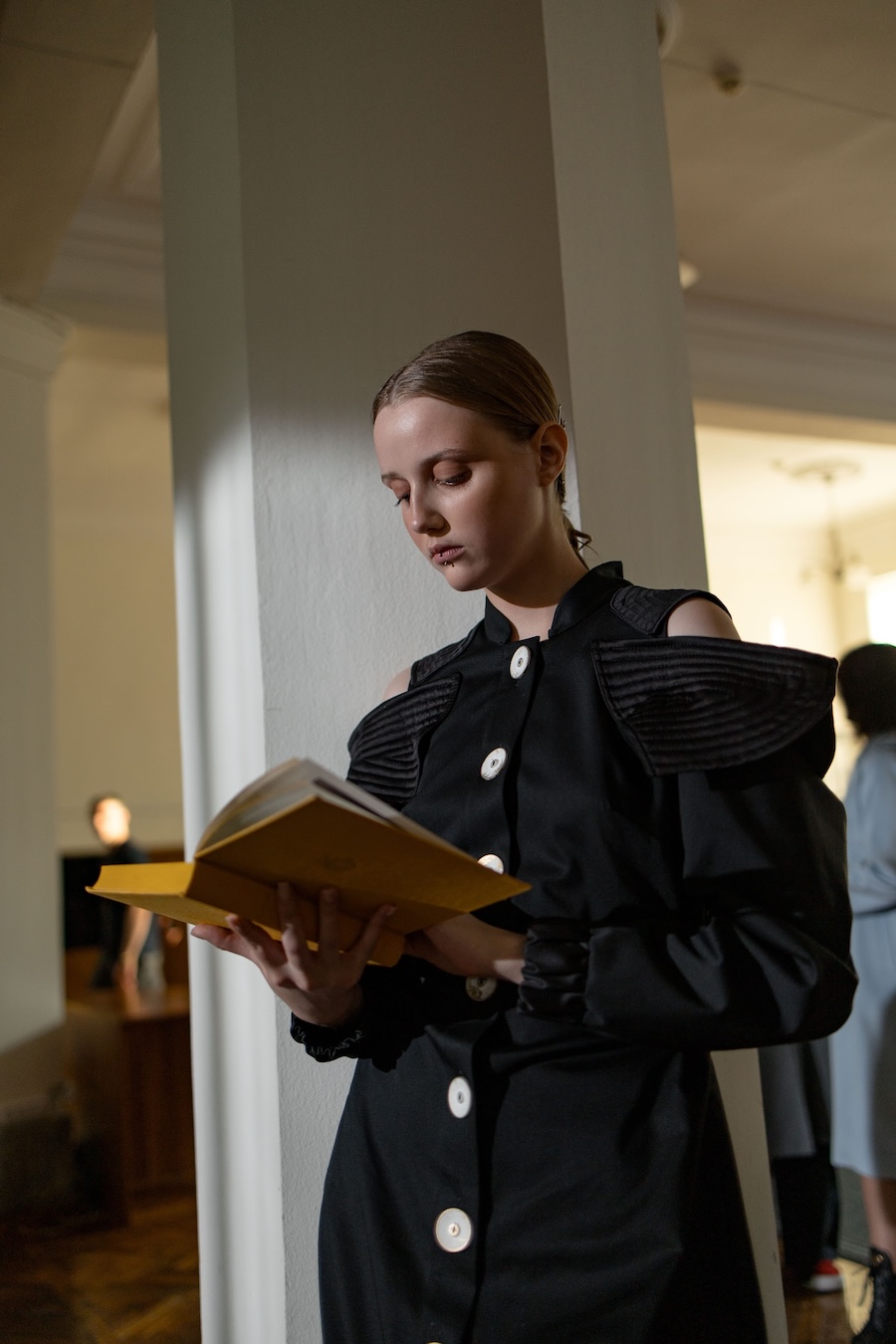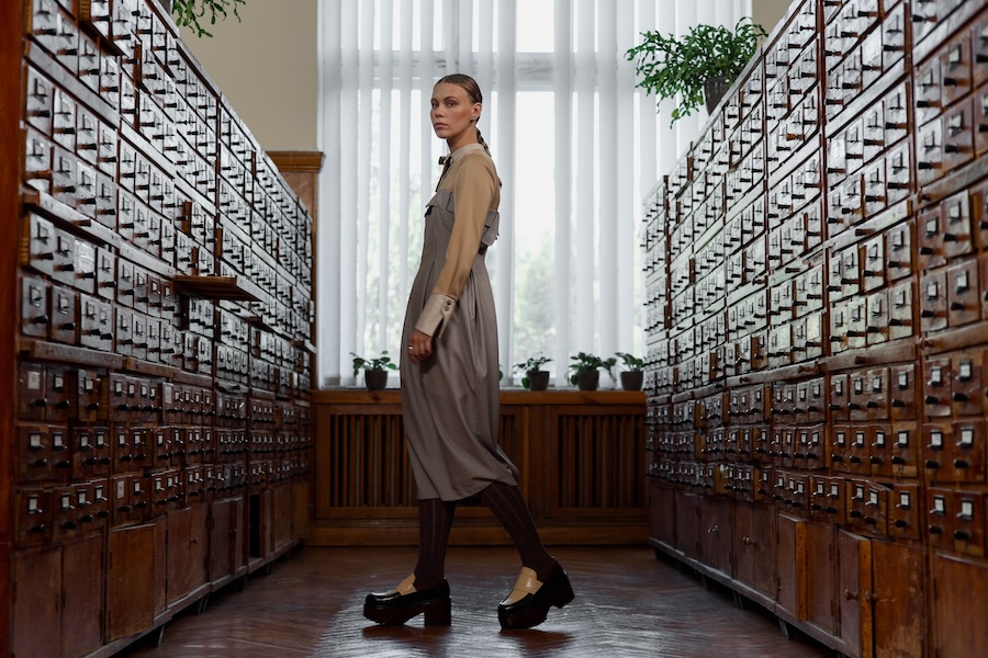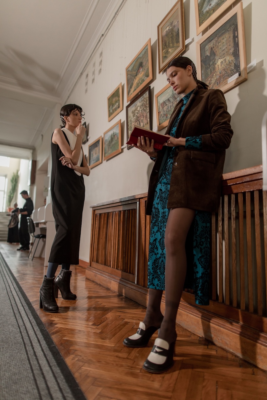 Креативный директор Наталья Митерева виртуозно отработала пространство: выстроила любопытные мизансцены, модели расположились и на лестничных проемах, и в огромном читальном зале, и в холле, а художественный свет создавал особую атмосферу. Модели были реально погружены в чтение книг, и потом, уже по завершению события, обменивались между собой информацией о прочитанном. В залах звучали стихи Андрея Вознесенского на английском языке.