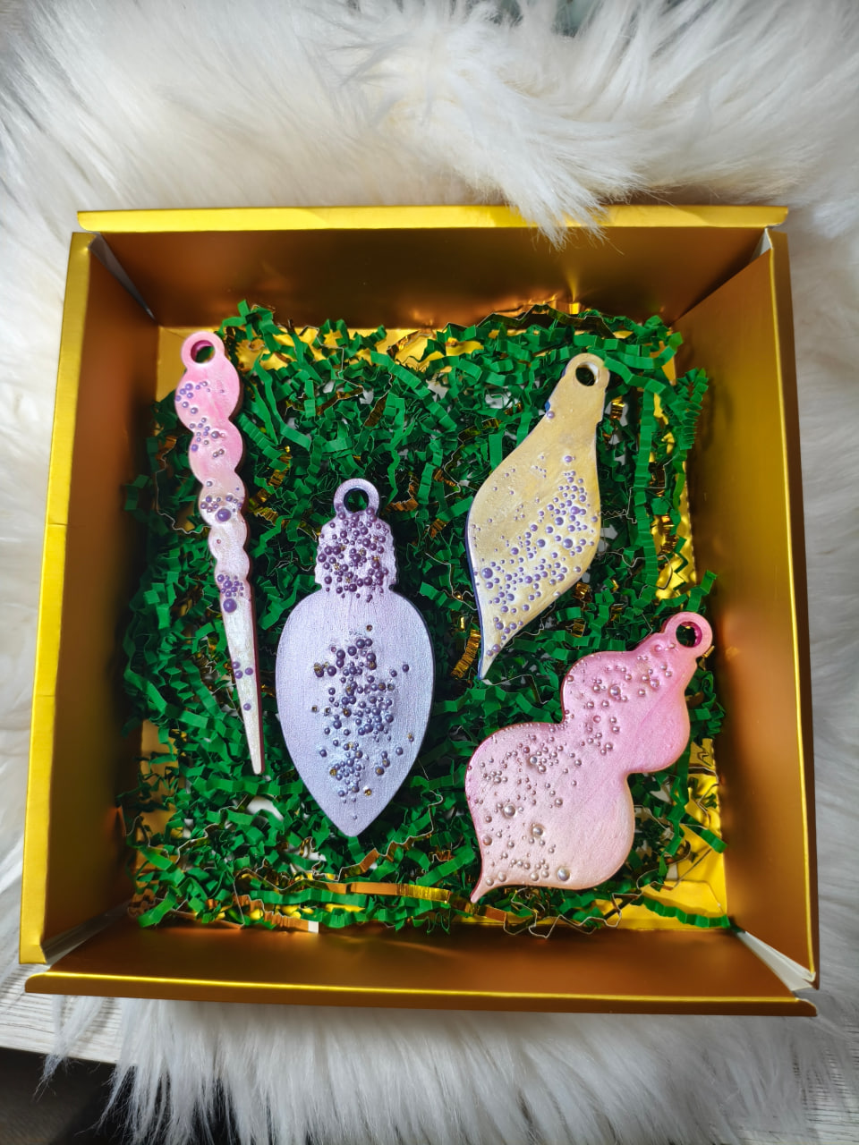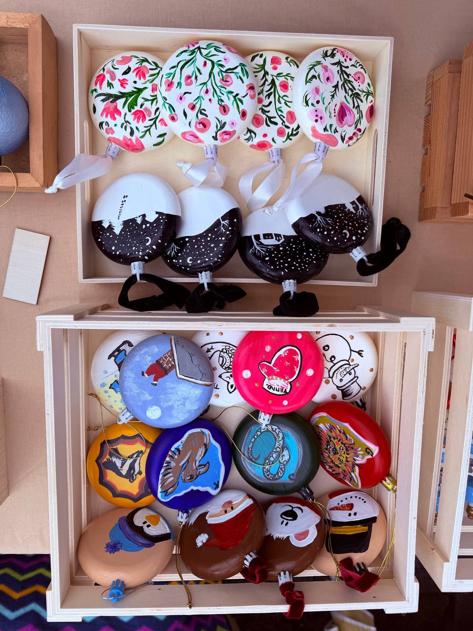 Сейчас в Amíche можно найти елочные игрушки, непохожие на те, что предлагает масс-маркет. Таня и Жанна работают с легкими полимерными материалами, декоративными покрытиями, акриловыми красками и качественной фурнитурой. Для них важно, чтобы игрушки были не только яркими и праздничными, но и безопасными и долговечными.