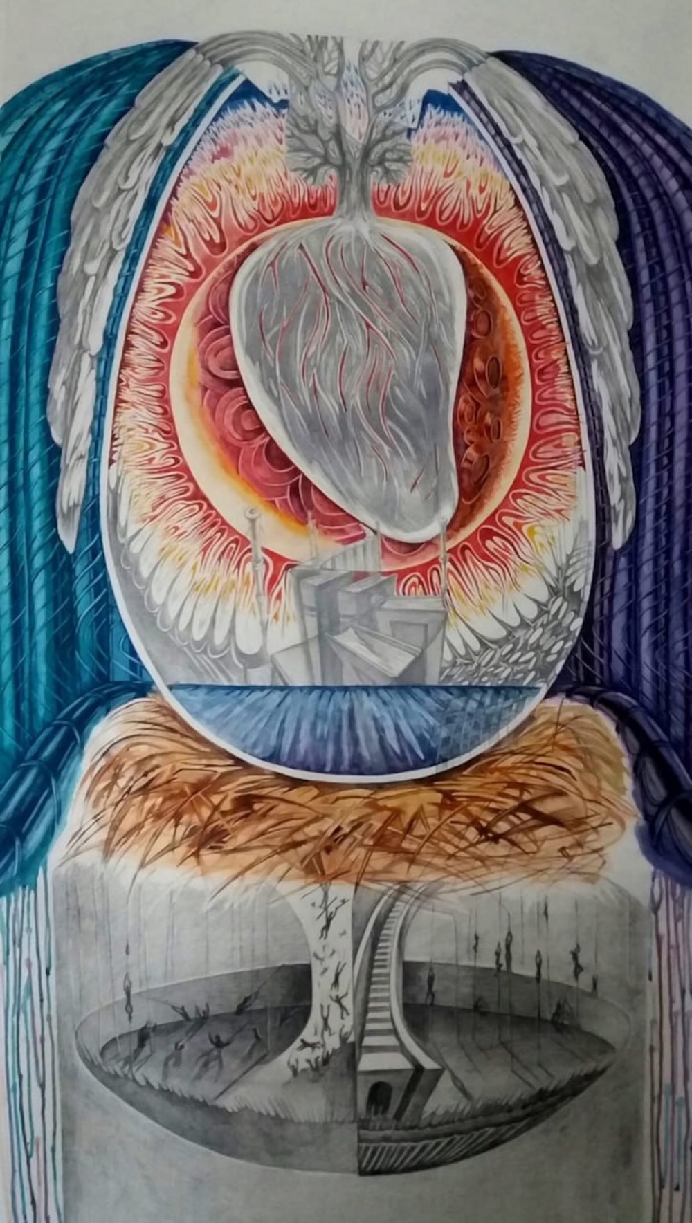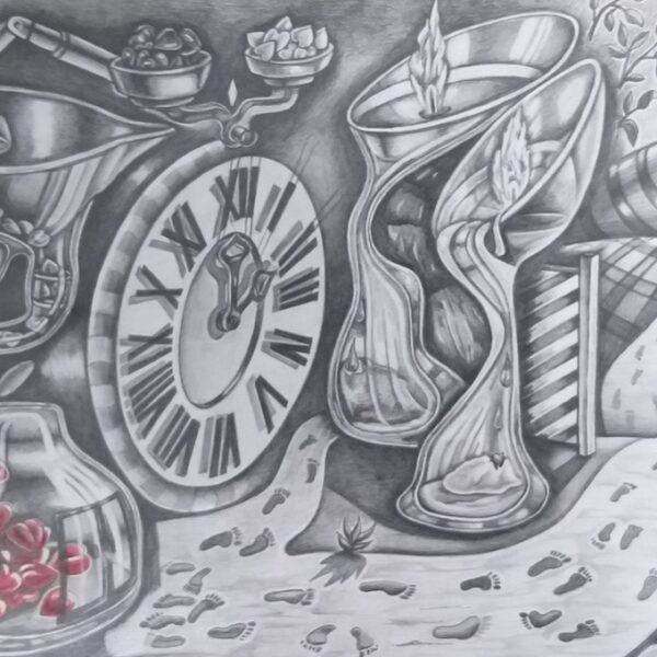 Когда пишу картину, то буквально живу в ней. Это не метафора. Каждый элемент появляется через личное переживание сюжета. Вот, например, картина с песочными часами. Говорят, они похожи на сердце. А два белых шара внутри появились спонтанно. Когда работа была почти готова, я вдруг почувствовал, что мне не хватает в ней воздуха. Добавил эти два шара — и в картине появился кислород.