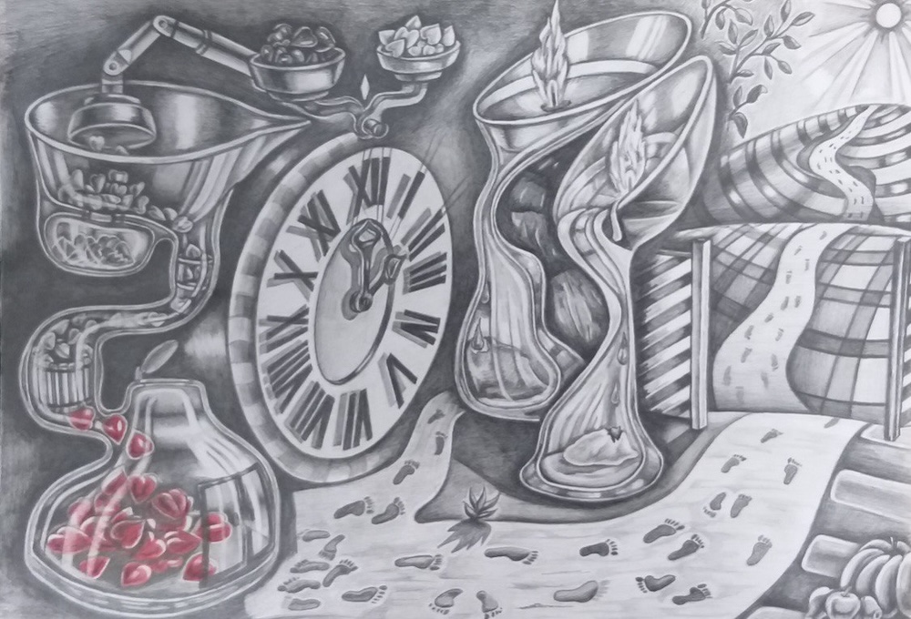 Когда пишу картину, то буквально живу в ней. Это не метафора. Каждый элемент появляется через личное переживание сюжета. Вот, например, картина с песочными часами. Говорят, они похожи на сердце. А два белых шара внутри появились спонтанно. Когда работа была почти готова, я вдруг почувствовал, что мне не хватает в ней воздуха. Добавил эти два шара — и в картине появился кислород.