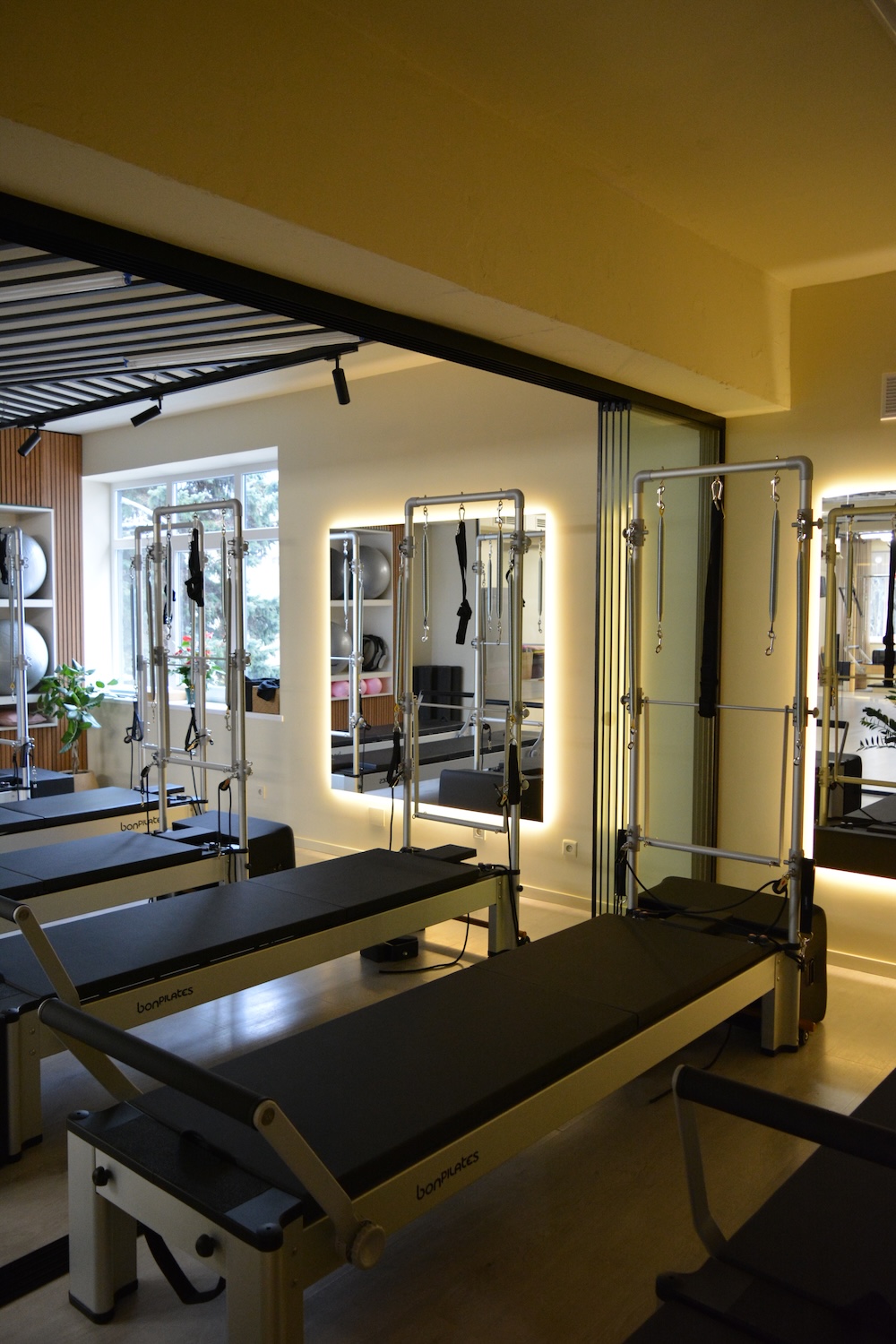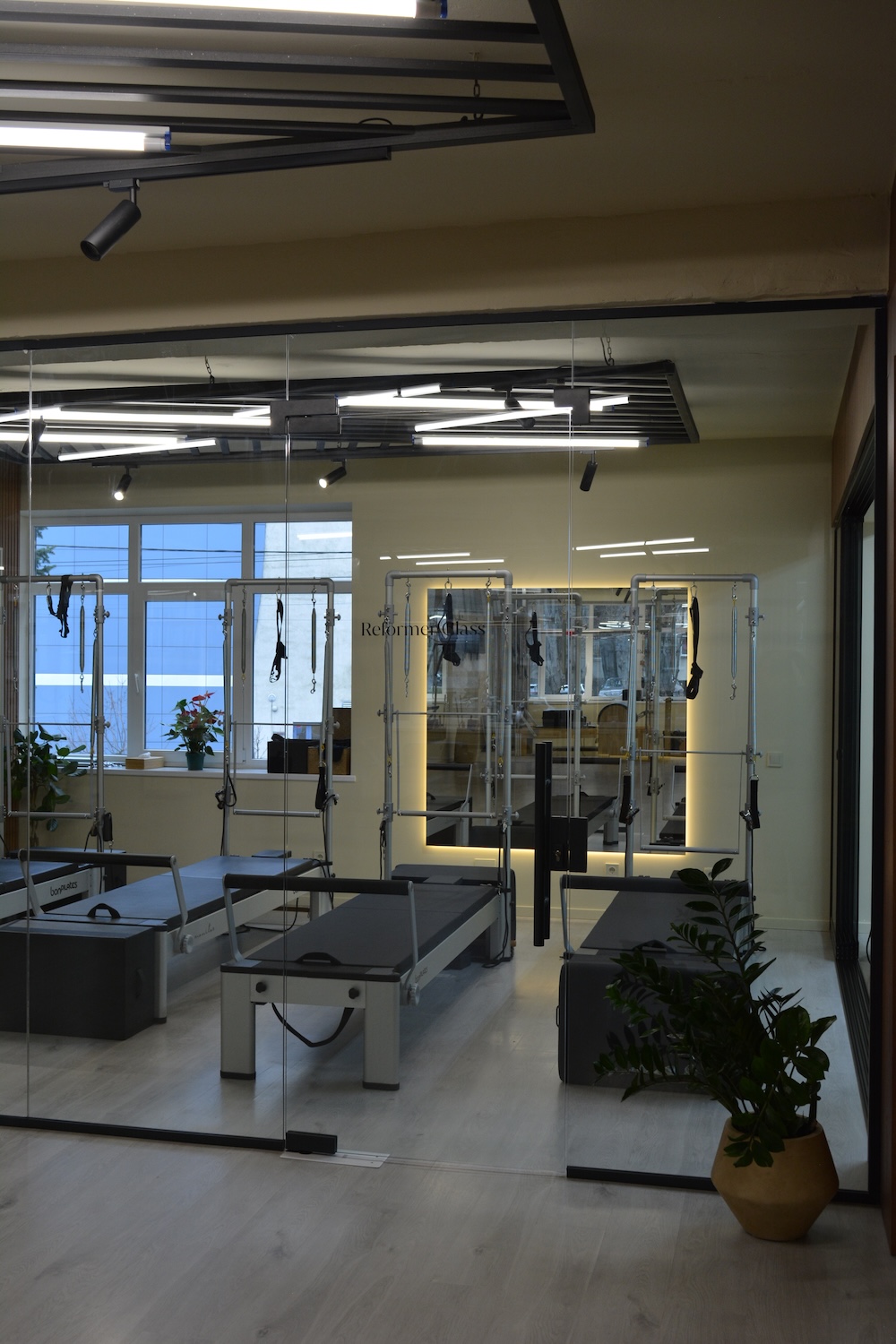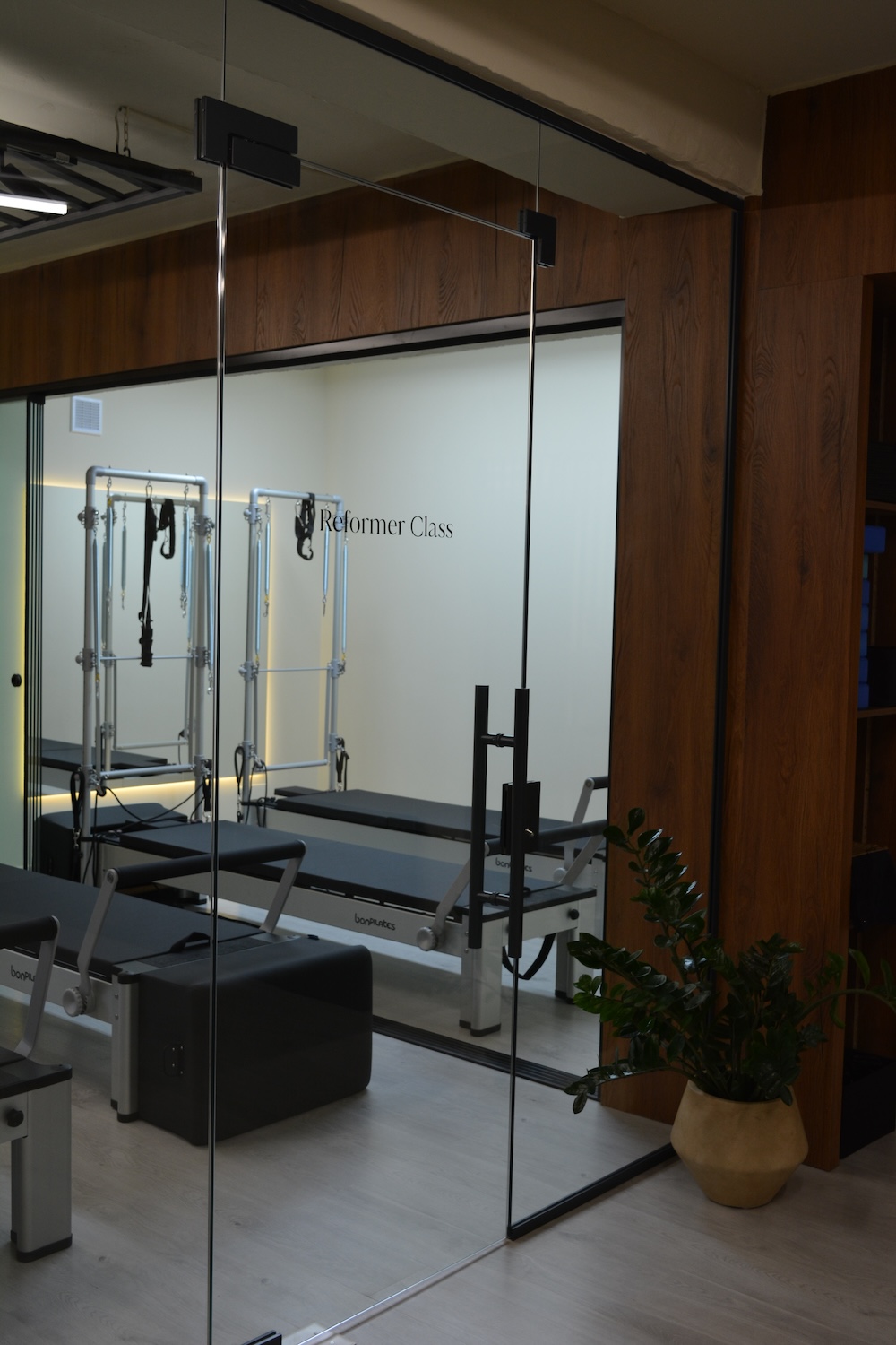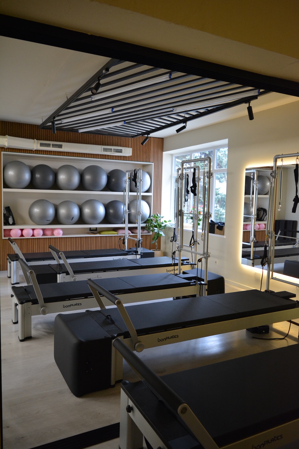 Studioul impresionează prin spațiul luminos și dublu ca mărime față de cel anterior, cu grupuri mici: 8–10 persoane la sol și 4–6 persoane pe aparatele Reformer. Atmosfera calmă, designul natural și atenția la detalii creează un loc în care îți este ușor să te concentrezi pe corp și respirație.