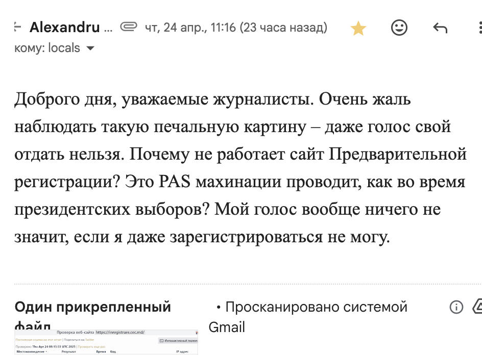 В Молдове активизировалась новая волна дезинформации. В редакции молдавских СМИ, в том числе locals.md, начали поступать одинаковые письма с жалобами на недоступность сайтов, связанных с государственными структурами — например, сайта предварительной регистрации для голосования и сайта международного аэропорта Кишинёва.