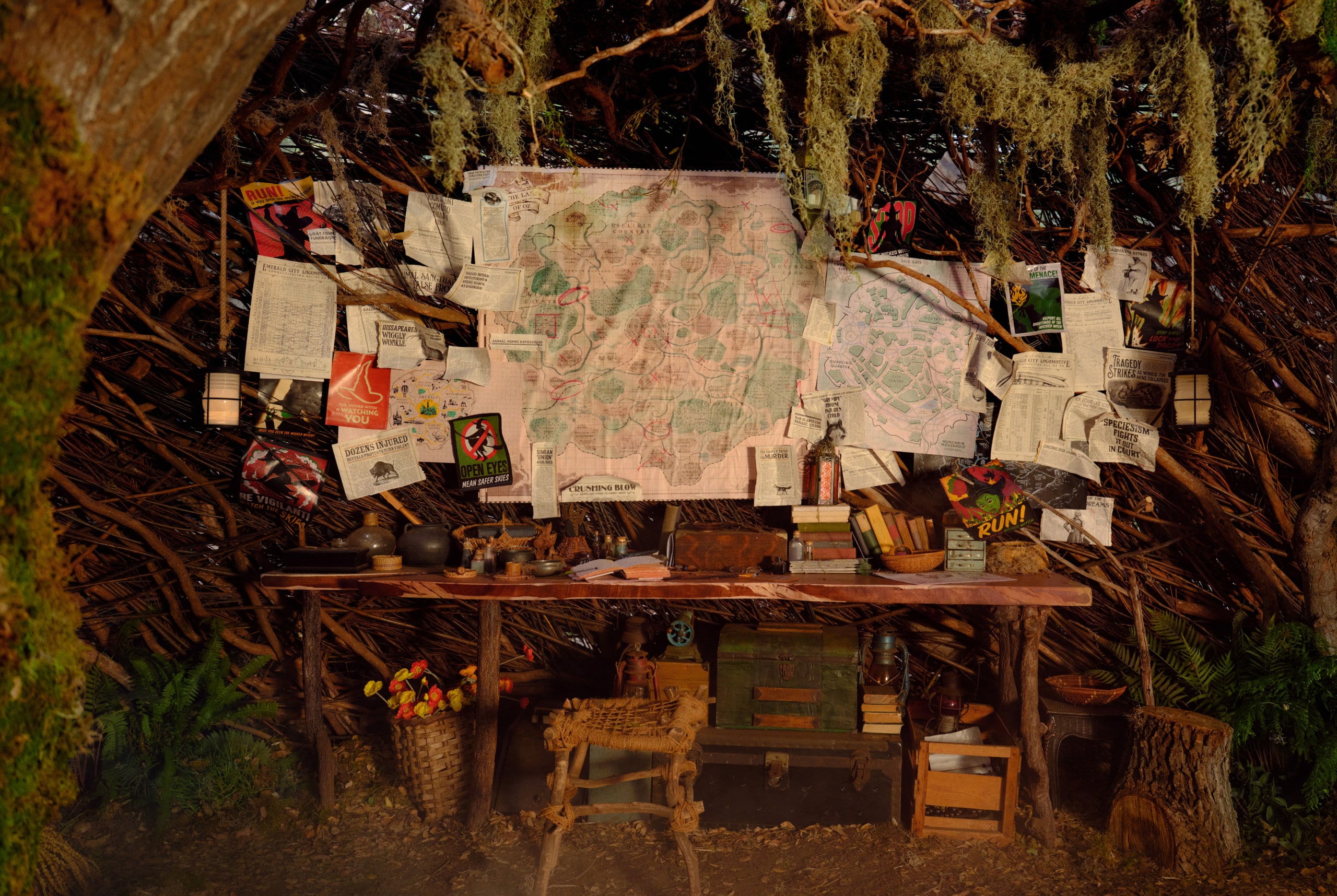 В комнате много атрибутов Эльфабы: знаменитая черная шляпа, метла и священная книга Гриммория. Присутствуют и другие отсылки к сюжету второй части «Злой» — например, постеры «Бегите!» с изображением волшебницы, карты страны Оз и склянки для зелий.