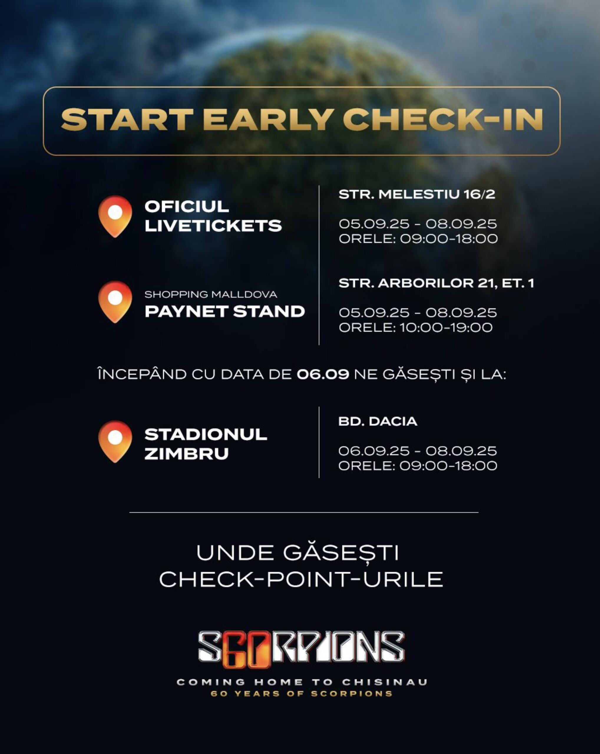 9 сентября 2025 года на стадионе «Зимбру» пройдет самый ожидаемый концерт осени – Scorpions. Впервые в Республике Молдова организаторы вводят систему Early Check-in, которая обеспечивает комфорт, безопасность и быстрый доступ в день события.