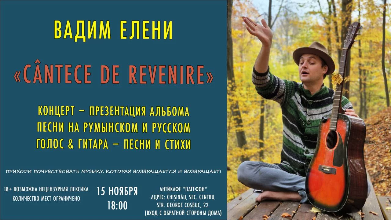 Концерт-презентация альбома «Cântece de revenire» Будут звучать авторские песни и композиции, вдохновленные стихами Еминеску, Алексанри, Лотеану и Пушкина — в живом, искреннем и акустическом исполнении Вадима Елени.