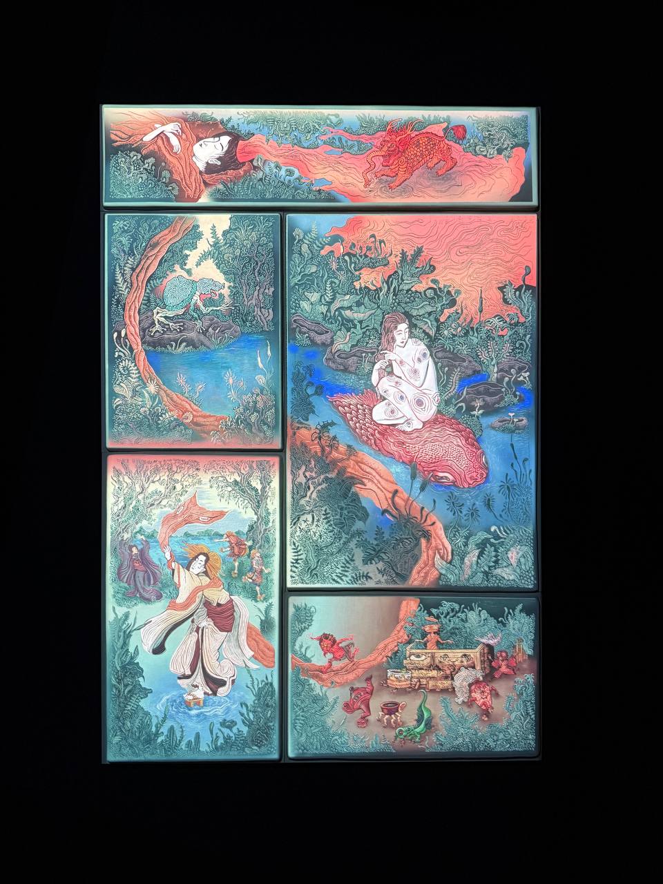 Одна из необычных инсталляций посвящена направлению в изобразительном искусстве Японии – укиё-э. Японцы создают гравюры с помощью техники ксилографии, но в Sensorica пять панно отлили из гипса и придали 3D форму изображениям ёкаев (духов).