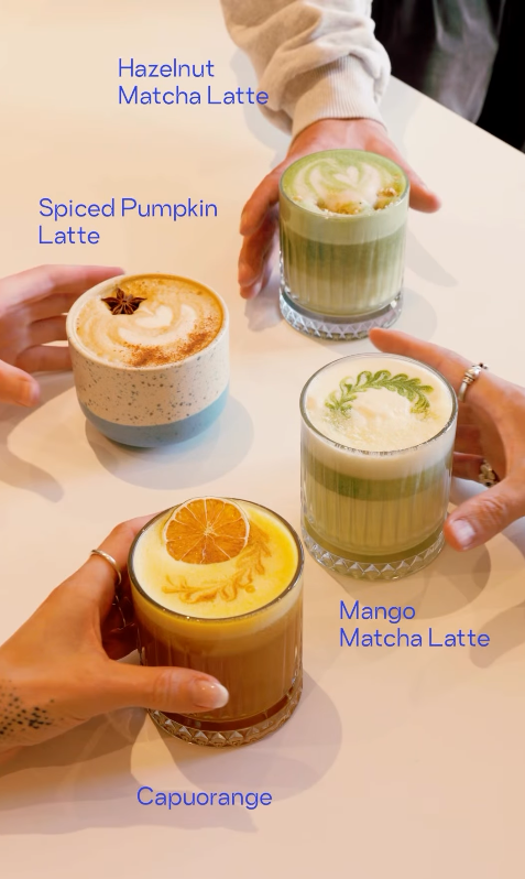 В кофейне четыре новых напитка: пряный тыквенный латте, манго матча латте, ореховый пряный латте, капуорандж (капучино с апельсиновым соком).