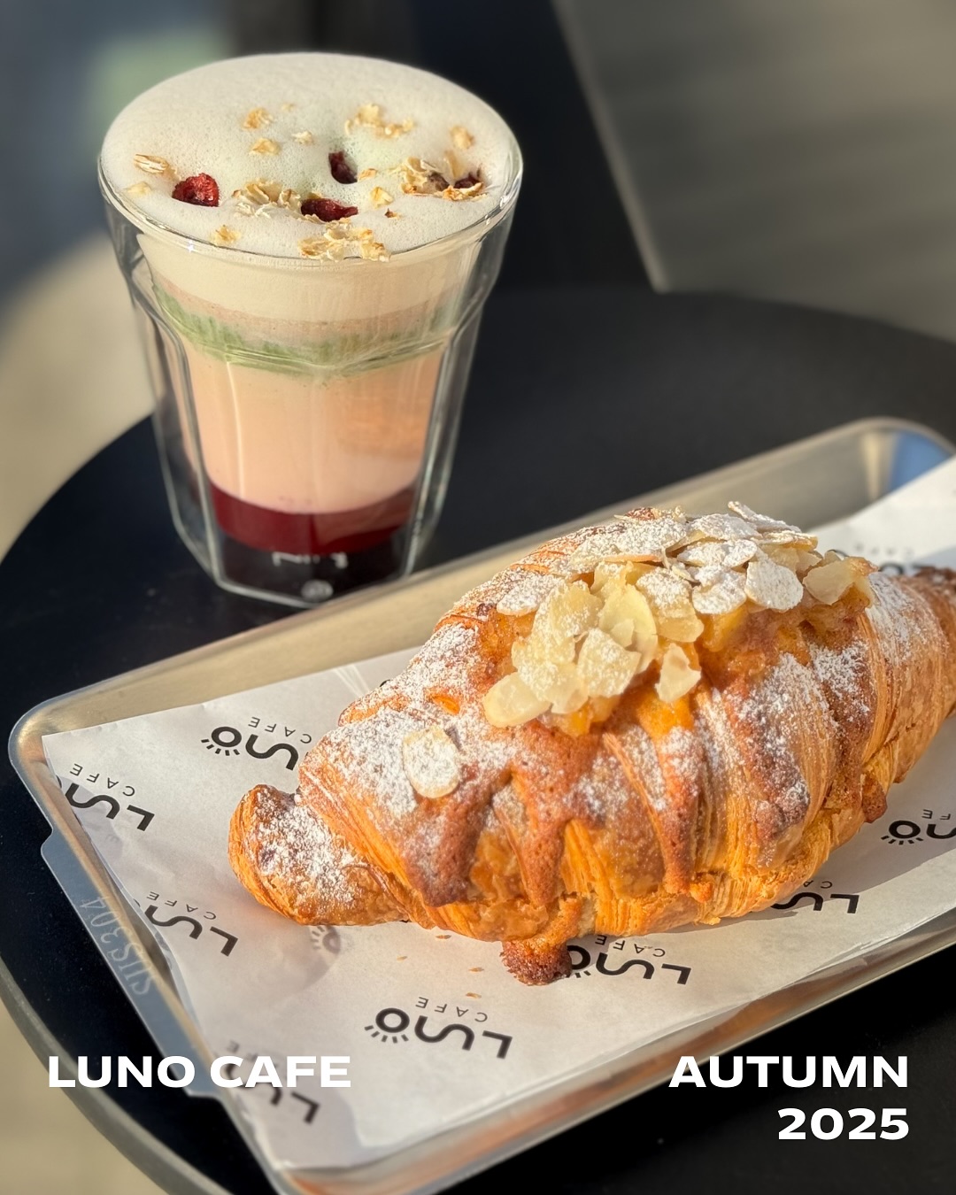 Luno предлагают капучино с орехом пекан и карамелью, фисташковый матча, тыквенный латте, клюквенный матча, шоколадный мокко Дубай, малиновый латте, кофе крем-сода, молочный чай с мятой, чай с айвой и розой, чай яблочный пирог.