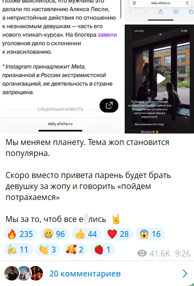 В июне 2025 года несколько девушек рассказали о домогательствах мужчин в центре Москвы. Позднее выяснилось, что к ним приставали участники «телесного тренинга» пикап коуча Алекса Лесли. Ученикам Лесли нужно было выполнить одно из заданий – подходить к незнакомкам на улице, хватать их за попу и предлагать заняться сексом в туалете. По итогу СК возбудил уголовное дело в отношении Алекса Лесли, а его учеников стали задерживать. Сам Лесли воспринимает это, как рекламу, получает удовольствие от нахлынувшей медийности и не переживает об уголовном деле, так как находится за пределами России.