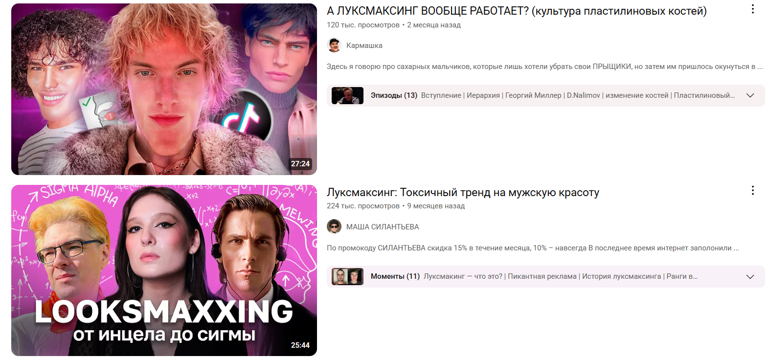 - группы луксмаксинга или «looksmaxxing» — участники обсуждают, как улучшить внешность, чтобы повысить сексуальную «рыночную стоимость». Пример, к которому они стримятся — персонаж Кристиана Бейла из фильма «Американский психопат».