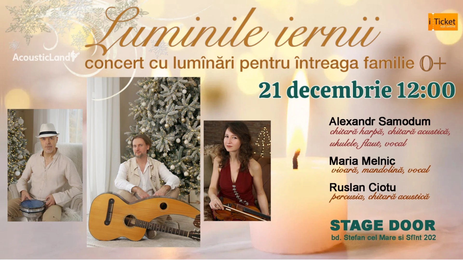 В зале детского театра «Stage door» при свете свечей и праздничных огоньков, среди мерцающих рождественских елей прозвучит сказочная музыка на уникальных музыкальных инструментах со всего мира. В этот день гитара арфа, флейта, скрипка, укулеле, мандолина, дарбука и звонкие тамбурины расскажут всем свои волшебные зимние истории.