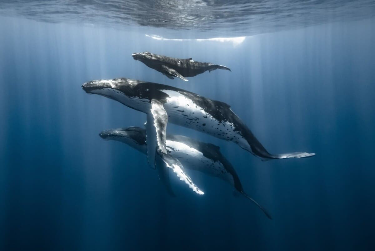 Высокая оценка жюри: три горбатых китов идеально выстроились в ряд, демонстрируя гармонию природы во французской Полинезии / © Rachel Moore