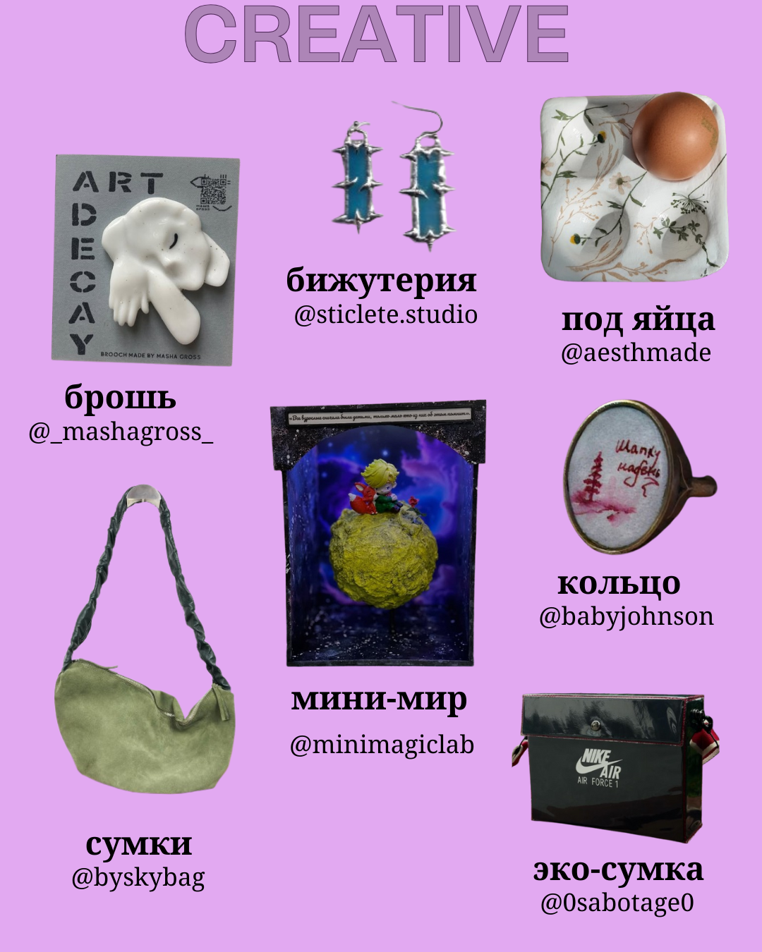 Если хочется, чтобы подарок был необычным и непохожим на все остальные, то вам к этим мастерам. Они создают креативные вещи, которые нигде не найти и о которых даже не подумаешь, покупая подарки. Броши, бижутерия, сумки и рюкзаки, эко-сумки из переработанных отходов и многое другое.
