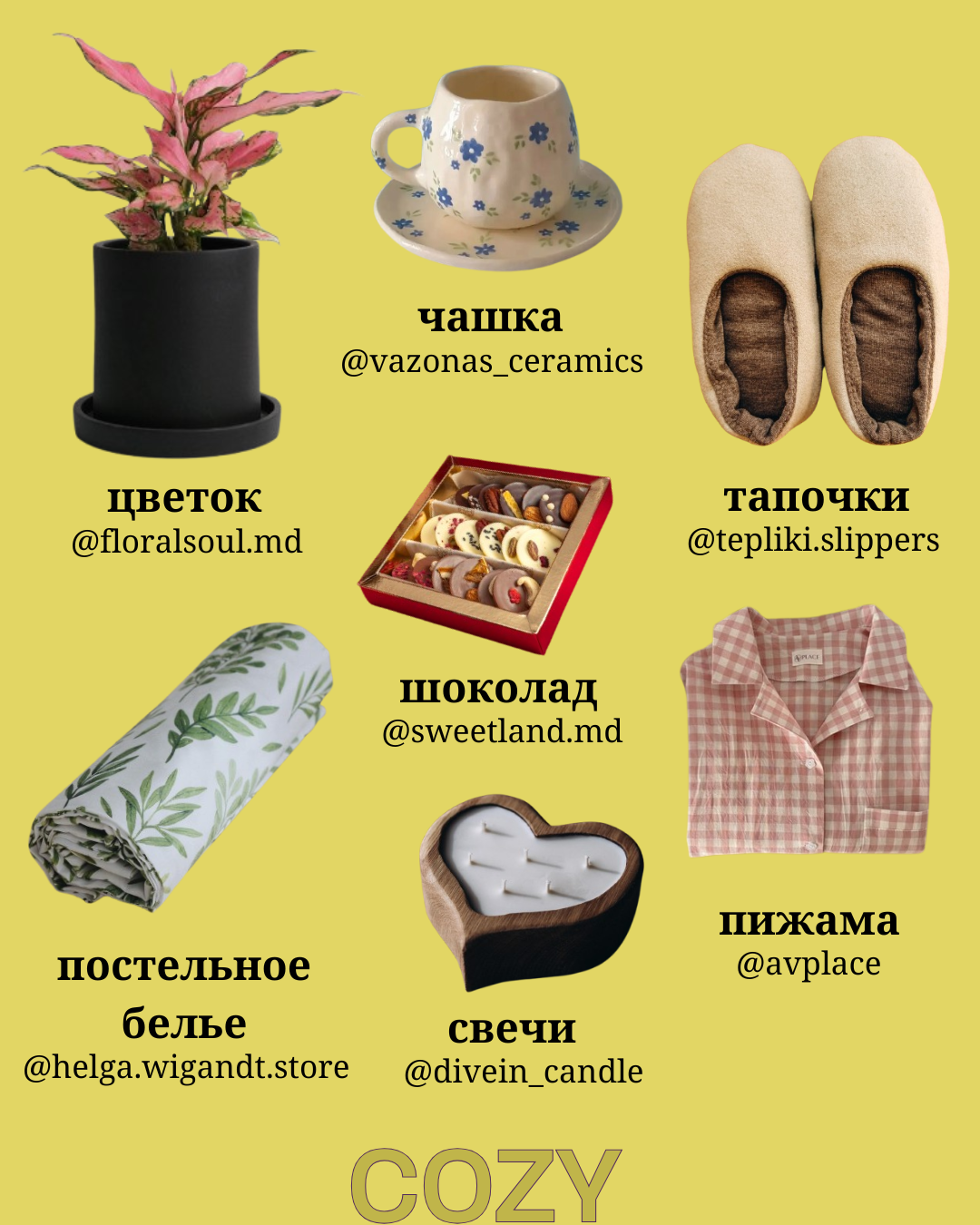 Все, что нужно, чтобы дома было тепло, уютно и вкусно пахло. Свечи, тапочки, пижама, посуда и даже сладости.