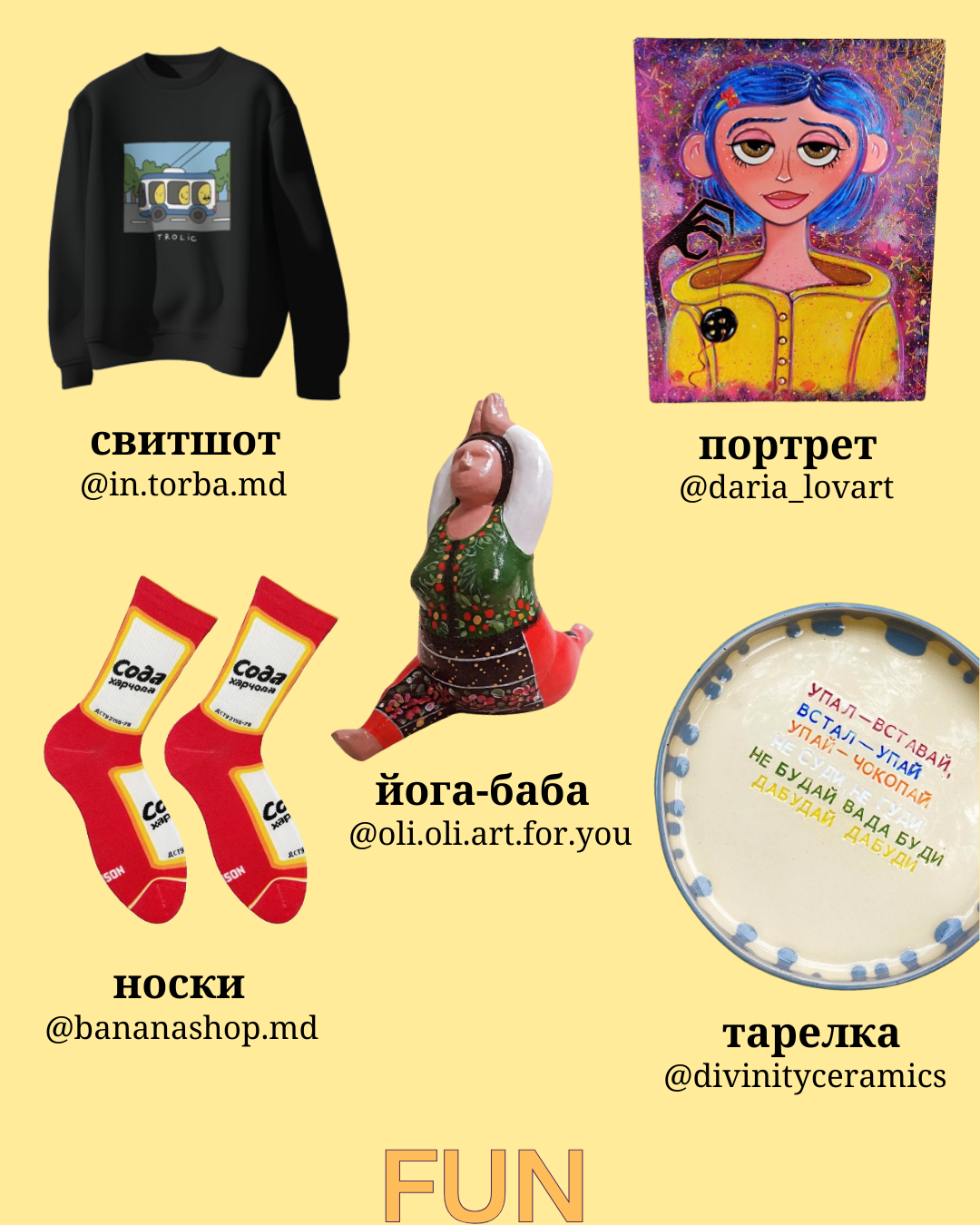 Смешные подарки, которые поднимут настроение в эти пасмурные и дождливые дни. Свитшоты, носки с принтом соды или соли, мультяшные картины и даже фигурки йога-баб в молдавской одежде.