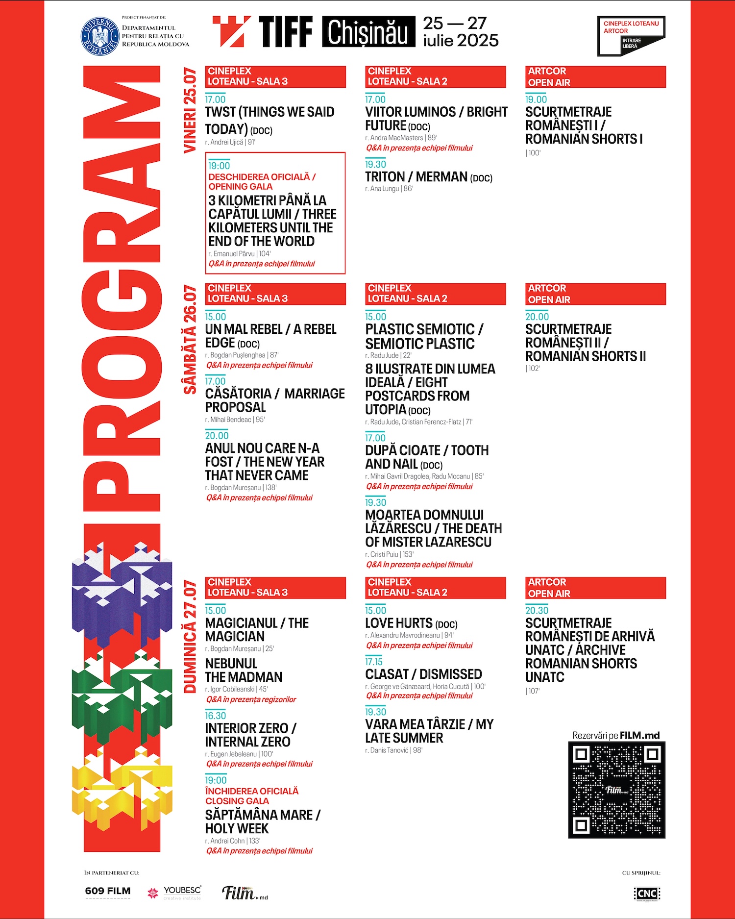 «TIFF Chișinău полностью курируется и программируется командой Международного кинофестиваля Трансильвании. Отбор фильмов отражает наш подход, сформированный за более чем два десятилетия: стремление к качеству, разнообразию, свободе выражения и поддержке ярких голосов румынского и мирового кино».