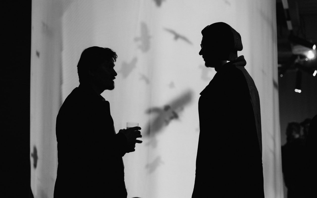 Некоторые объекты — особенно цианотические отпечатки в смоле и стеклянные скульптуры — задерживают дыхание. Они фиксируют момент, останавливают движение, делают его осязаемым. Это как если бы время сгустилось и стало телесным. Им противопоставлена видеоинсталляция: стая воронов закручивается в вихрь. Здесь всё построено на движении: на ритме, тревожной цикличности, на невозможности удержать форму. Это время не линейное, а скорее круговое, пульсирующее, которое не даёт опоры.