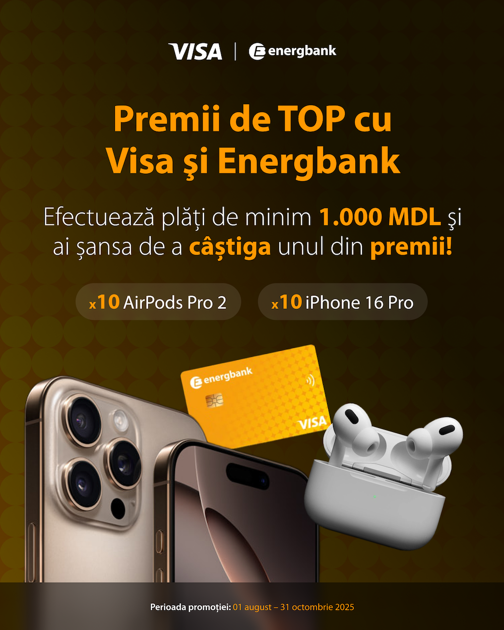 Plătești cu Visa de la Energbank? Poți câștiga un iPhone 16 Pro sau AirPods Pro 2!