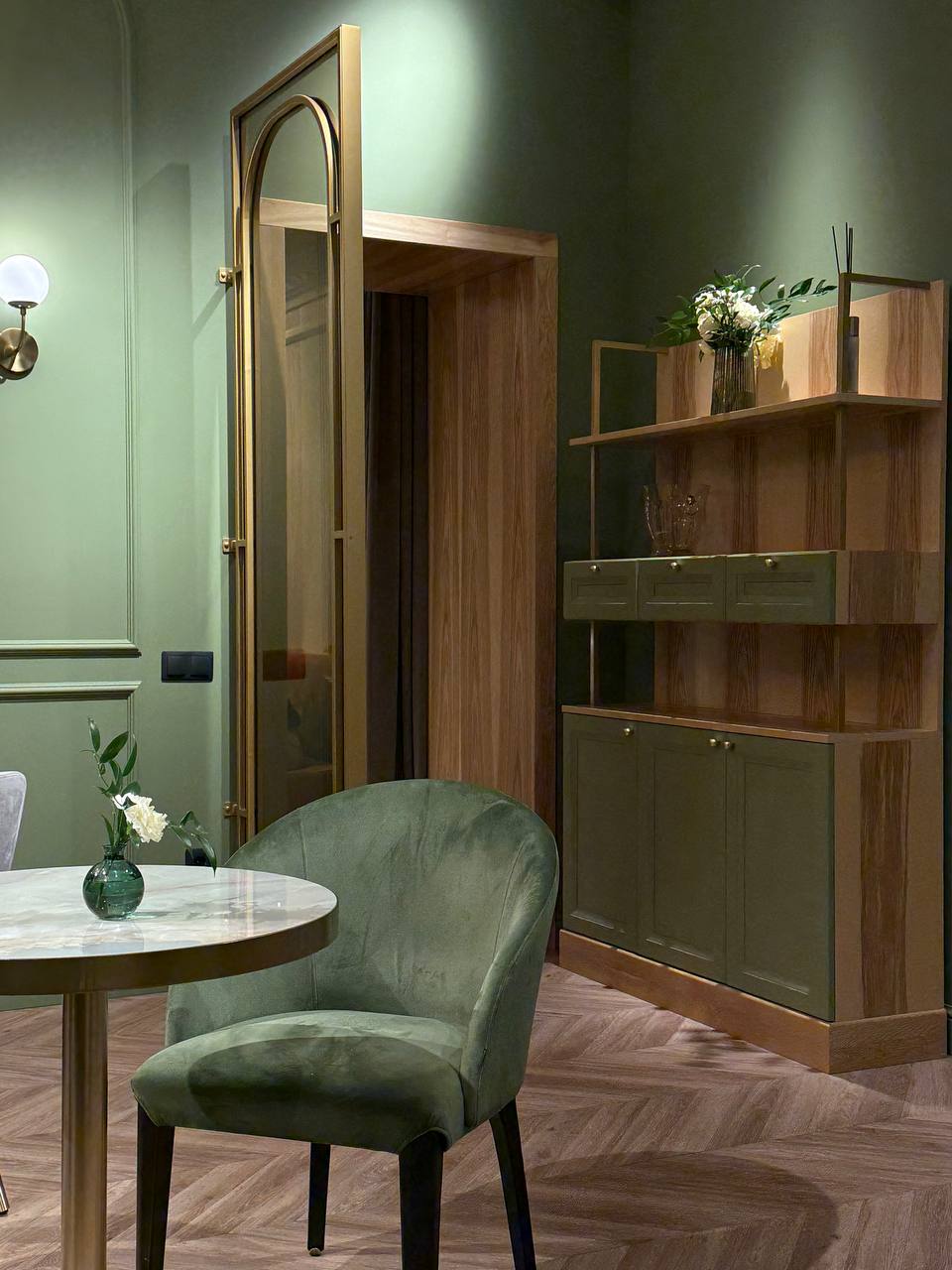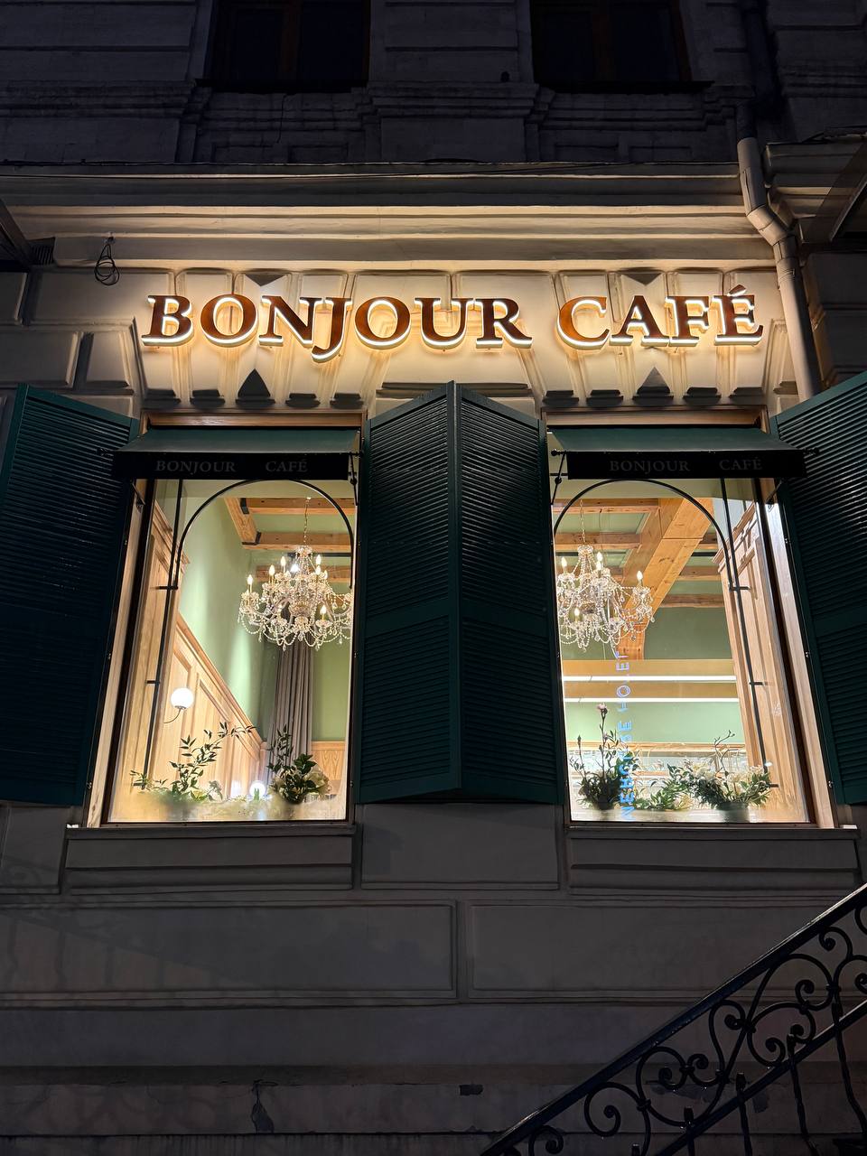 Интерьер выполнен в привычной для Bonjour стилистике: зеленая цветовая гамма, вывеска со ставнями, живые цветы и посуда в винтажном духе создают атмосферу «маленькой Франции» в центре города. Пространство камерное — всего два зала. Небольшой находится сразу при входе, а основной, более просторный, спрятан в глубине. Здесь предусмотрен стол для больших компаний. Туалет расположен на втором этаже, к нему ведет винтовая лестница.