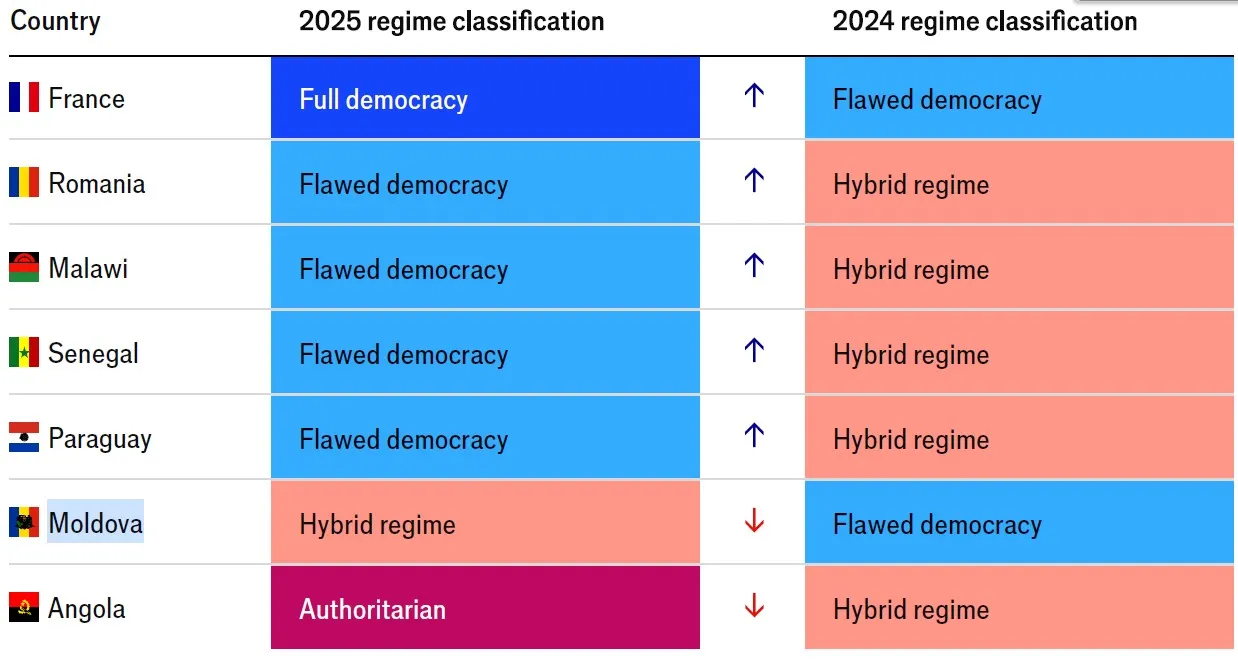 Республика Молдова была понижена в Глобальном Индексе демократии за 2025 год, составленном журналом The Economist, перейдя из категории «несовершенных демократий» в разряд «гибридных режимов». Основными причинами стали ухудшение ситуации с политическим плюрализмом, организацией выборов и усиление давления на оппозицию, что приближает страну к авторитарным моделям, передает TV8.