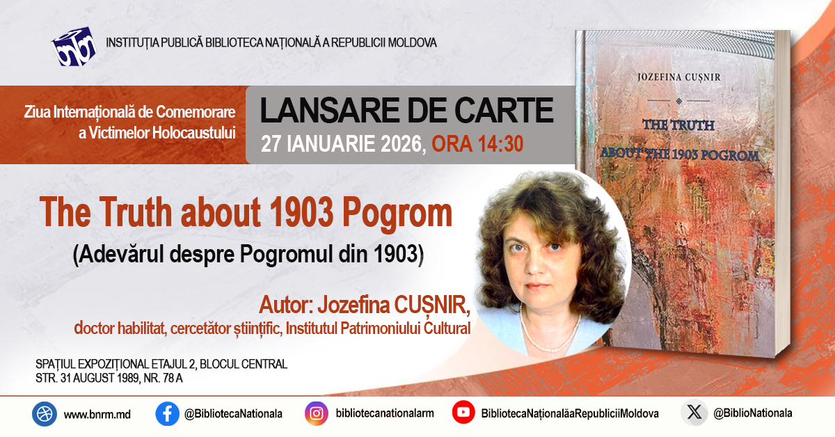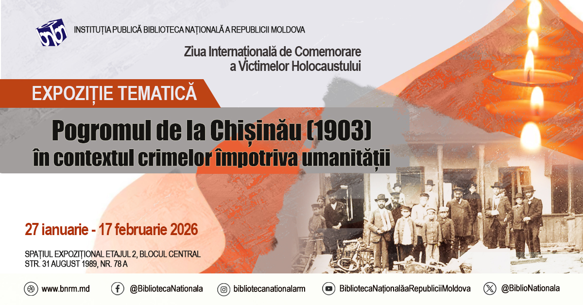 В Международный день памяти Холокоста в Национальной библиотеке Республики Молдова откроется выставка «Кишиневский погром 1903 года в контексте преступлений против человечности». Экспозиция включила большой объем материалов о жизни еврейского населения исторической Бессарабии, документы и научные исследования о погроме 1903 года и, в более широком контексте событий XX века, документы о Холокосте еврейского народа.