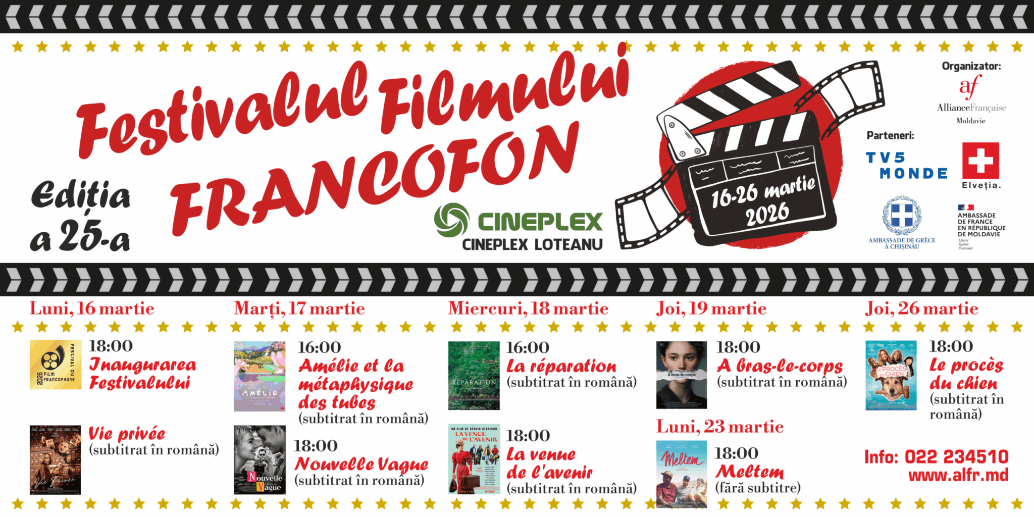 С 16 по 26 марта в Молдове пройдет юбилейный 25-й выпуск Фестиваль франкоязычного кино. В программе смелые художественные фильмы, проникновенные истории, анимационные фильмы, трогательные комедии и уникальные работы: