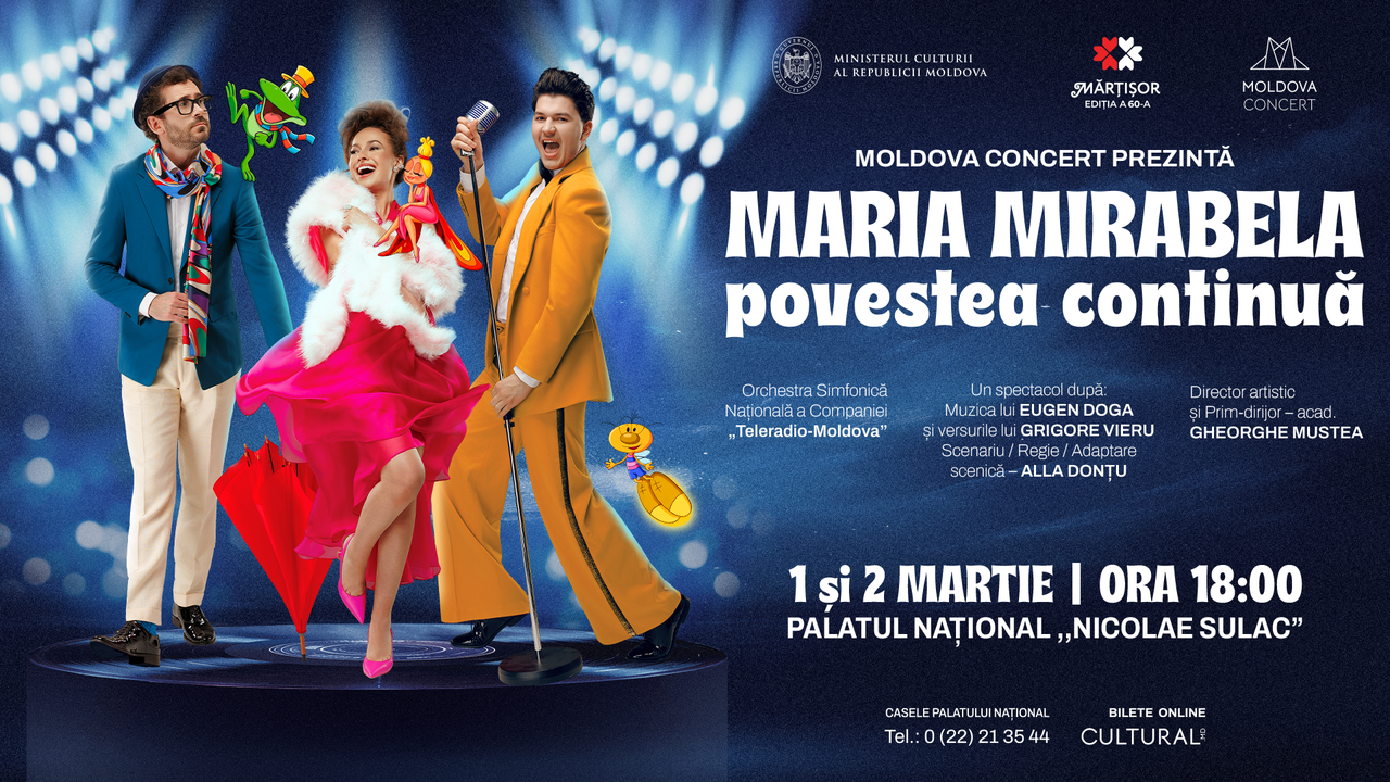 В Национальном дворце им. Николае Сулака зрители увидят современную интерпретацию культового советско-румынского фильма-сказки «Мария, Мирабела» 1981 года. Мюзикл объединяет живые выступления, интерактивные декорации и 3D-технологии. Живое звучание музыки из фильма обеспечивает Национальный симфонический оркестр «Teleradio-Moldova» под руководством главного дирижера Георге Мустя.