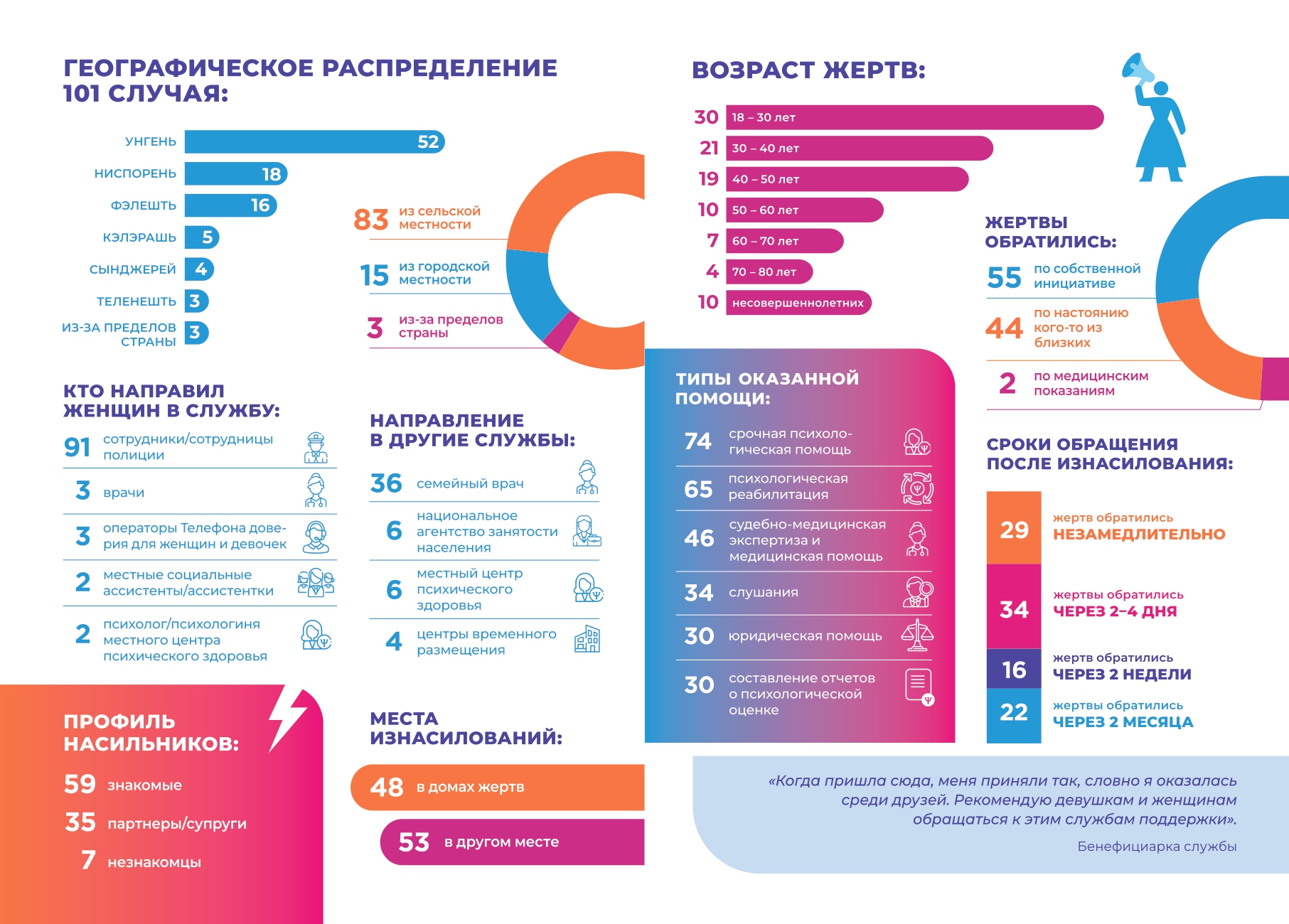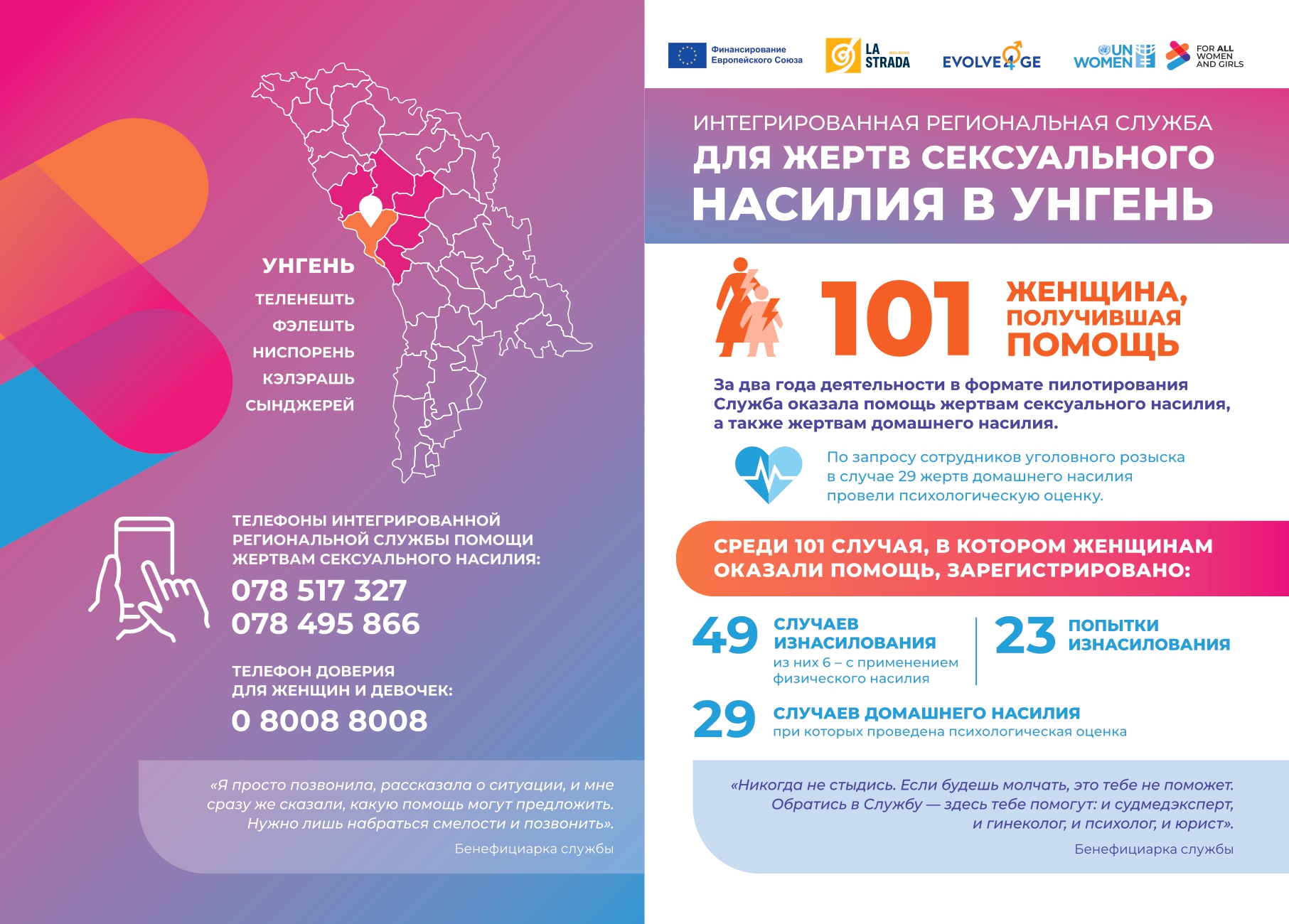 За два года работы в рамках пилотного этапа Интегрированная региональная служба оказала помощь 101 женщине, столкнувшейся с сексуализированным насилием. Служба находится в Унгенах и координируется Международным центром La Strada. Пострадавшие могут получить сразу несколько видов помощи в одном месте — медицинскую, психологическую, юридическую и социальную. Обратиться сюда могут женщины и девушки из шести районов: Унгенского, Фэлештского, Сынджерейского, Кэлэрашского, Ниспоренского и Теленештского.