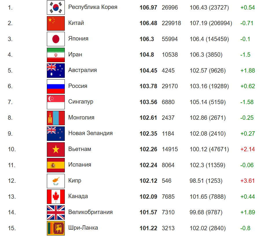 Первую пятерку заняли Южная Корея (106,98), Китай (106,48), Япония (106,3), Иран (104,8) и Австралия (104,45).