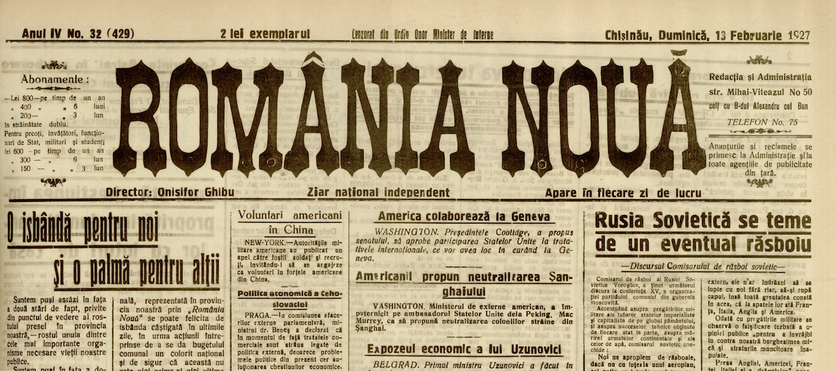 Объявление из газеты Онисифора Гибу "România Nouă" от 13 февраля 1927 года.