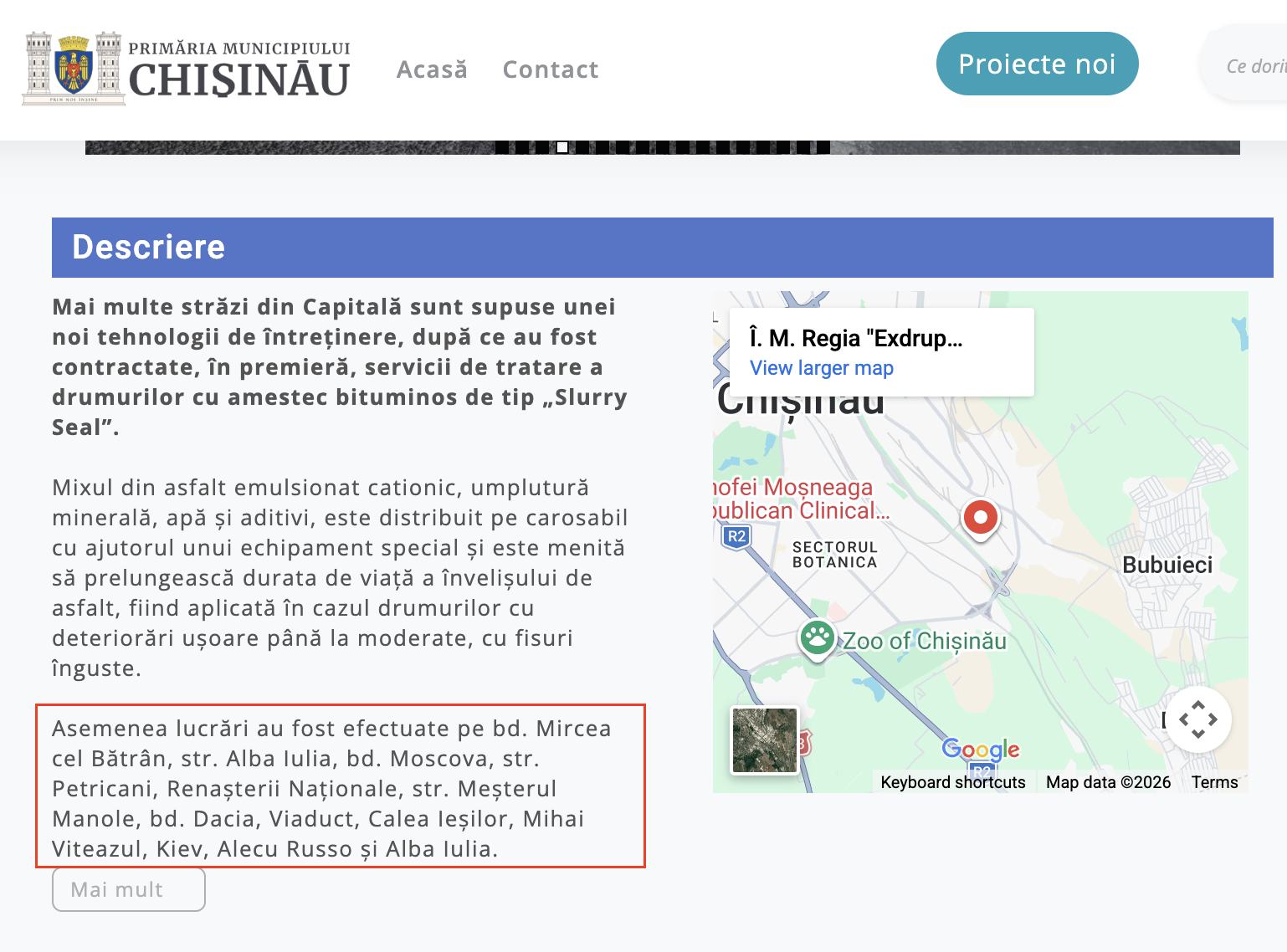 В подтверждение своих слов Киронда опубликовал фотографии повреждённых участков дорог и скриншот с сайта мэрии, где перечислены улицы, на которых проводились такие работы, включая бульвары Мирча чел Бэтрын, Московский бульвар, бульвар Дачия, Каля Ешилор, а также улицы Алба Юлия, Петрикань, Мештерул Маноле и Михай Витязул.