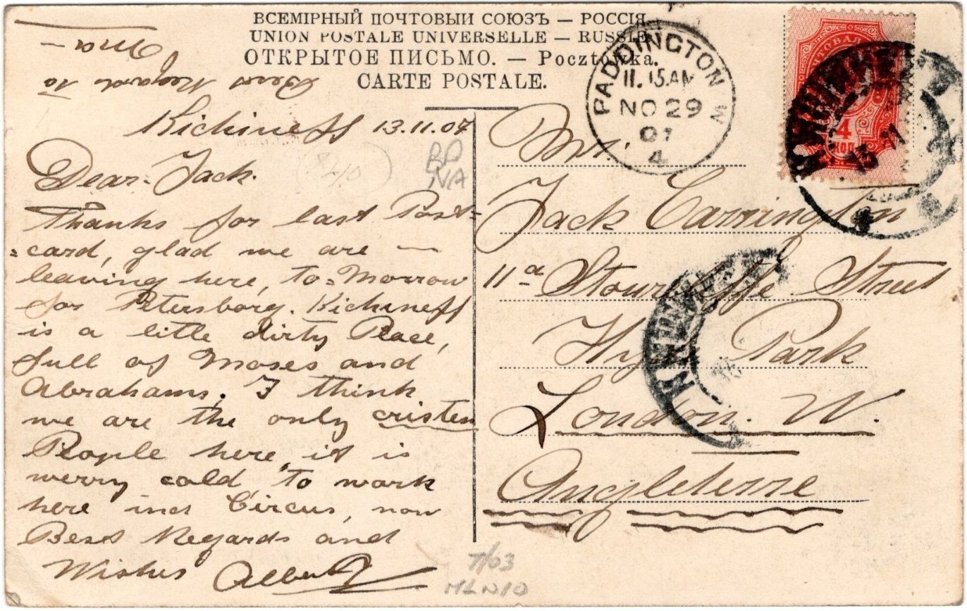 Из текста можно предположить, что британца звали Альберт (подпись довольно неразборчива), и что пишет он своему брату (в уголке открытки он передает приветы маме). Также, возможно, Альберт был в Кишинёве с гастролями — упоминается работа и цирк.