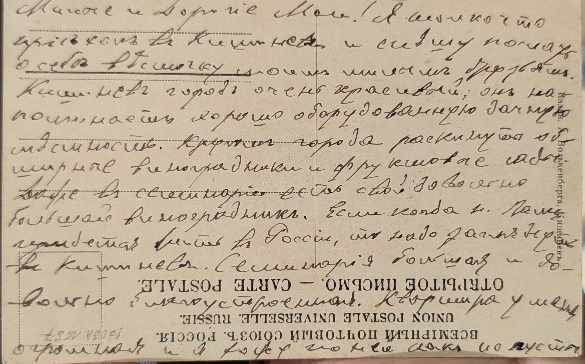 «Милые и дорогие мои! Я только что приехал в Кишинев и спешу послать о себе весточку моим милым друзьям. Кишинев город очень красивый, он напоминает хорошо оборудованную дачную местность. Кругом города раскинуты обширные виноградники и фруктовые сады. Даже в семинарии есть свой довольно большой виноградник. Если когда-нибудь вам придётся быть в России, то надо заглянуть в Кишинев. Семинария большая и довольно благоустроенная. Квартира у меня огромная и я хожу по ней, как по пустыне».