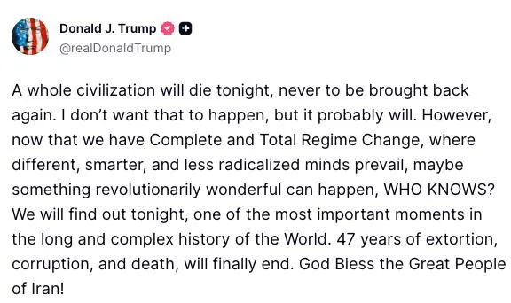 Трамп про истечение срока своего ультиматума Ирану: уже этой ночью может исчезнуть целая цивилизация